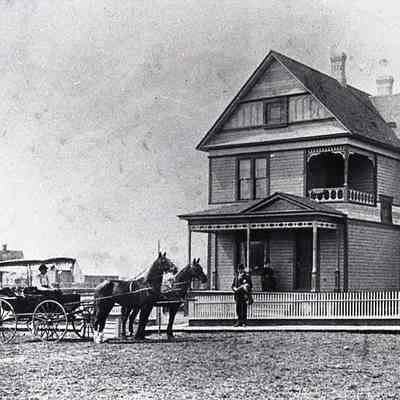 Picture of a buggy and two horses in the street in front of an unidentified house. Have negative.Collection