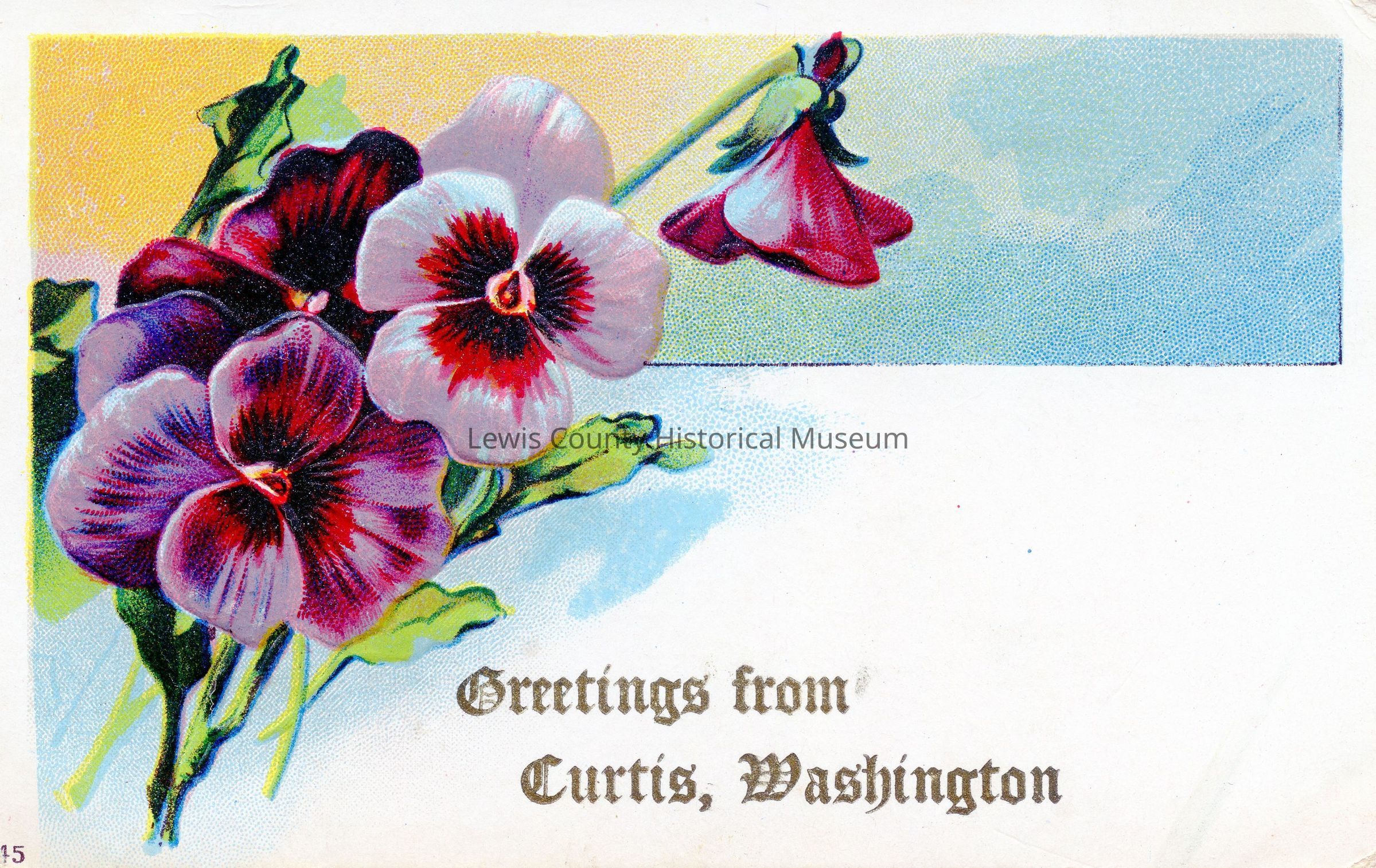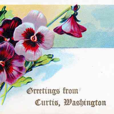 "Greetings from Curtis, Washington" printed on postcard.Lexicon