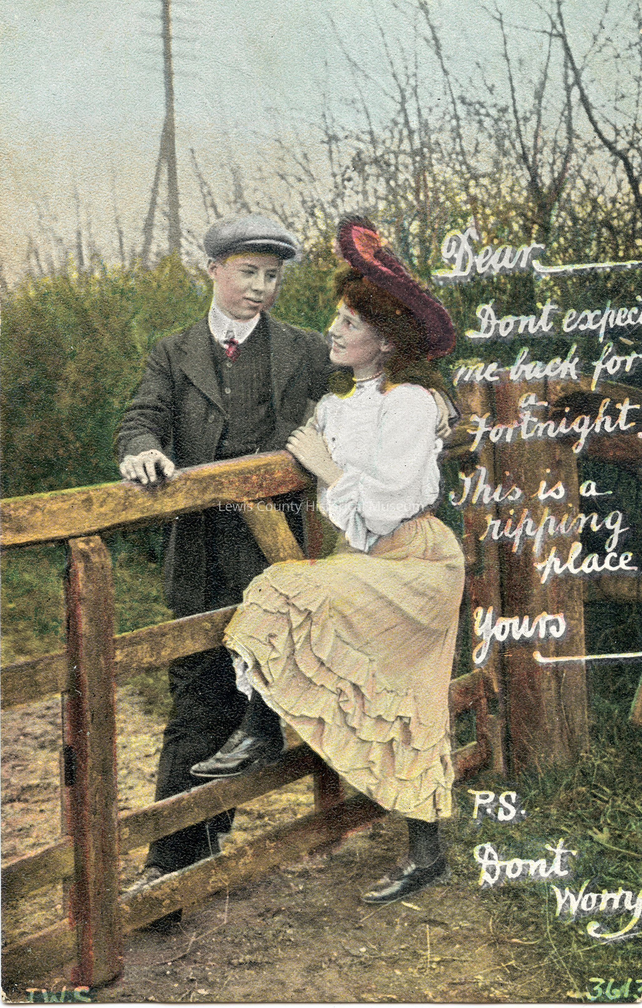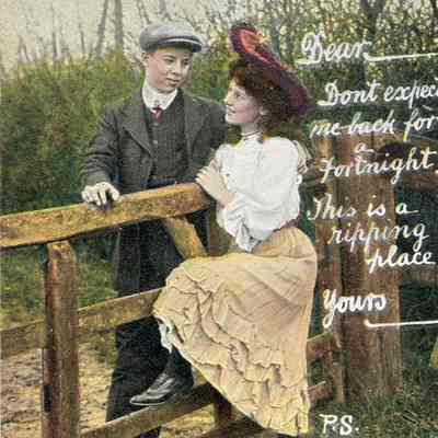 Picture of a boy and girl talking with a wood gate between them. "Dear ____ Don't expect me back for a fortnight. This is a ripping place. Yours ____ P.S. Don't Worry" printed on the postcard.Lexicon