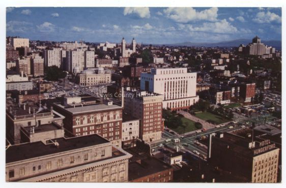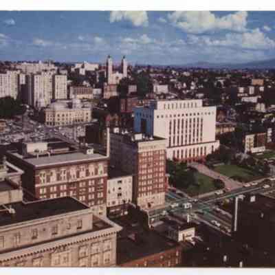 Color postcard - An overview of southeast hill in Seattle, WA. Harborview Hospital to the right and US Courthouse in the center. Photo circa 1965 - 1967.Lexicon