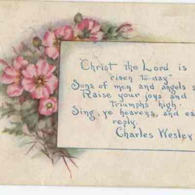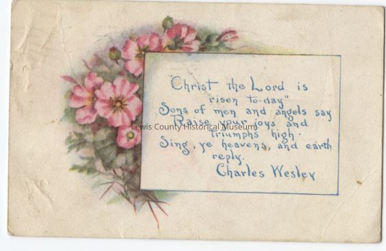 Easter Greeting, a religious theme verse, is surround by a cluster of pink colored flowers. Postmark: Redoak, Iowa, Apr. 1, 1912.Cataloged By