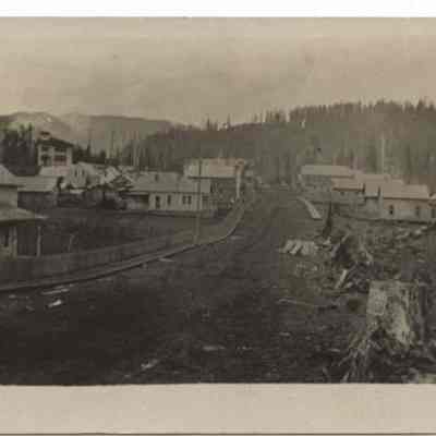 Black & White postcard - Mineral, WA. Overview of Main Street shows school, many homes, business buildings. Card sent from Mineral to Andrew Peterson in Port Angeles, August 1910.Lexicon