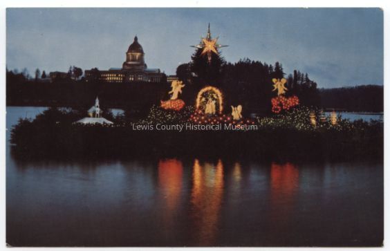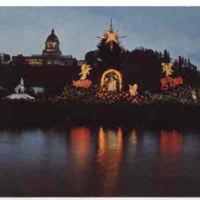 Capital Lake, Olympia, Washington, Christmas display of Madonna and Child on Christmas Island. Color printLexicon