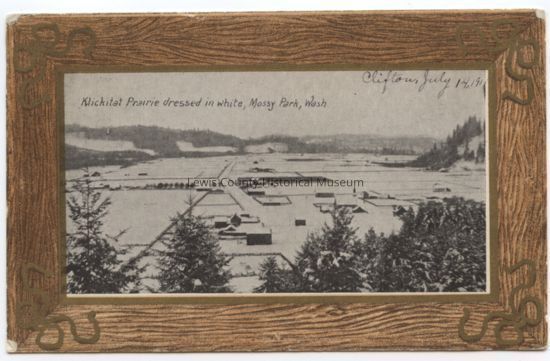Mossyrock, WA, snow covering the ground in photo taken on the rock of the Klickitat Prairie, message dated 7/7/1911. Postmark: Mossyrock, WA Jul 7, year illegible. 1¢ stamp 2007.59Lexicon