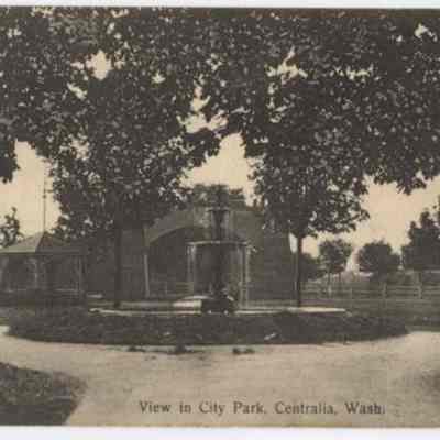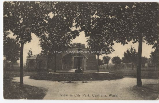 Postcard of fountain at the City Park in Centralia, WA. Circa 1909.Cataloged By