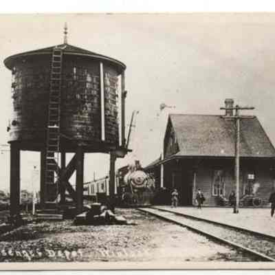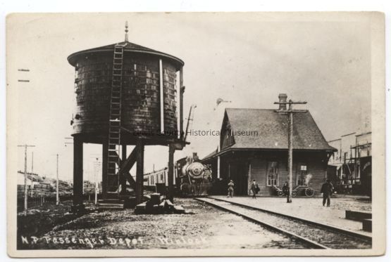 Passenger depot in Winlock, WA. C. 1910. Note the water tower to the left and the wooden structures to the right. These structures are part of Winlock. Have negative. Have slide.