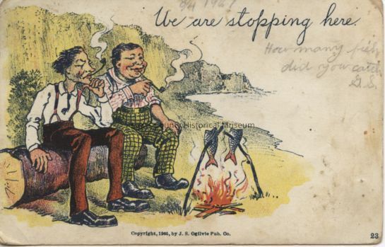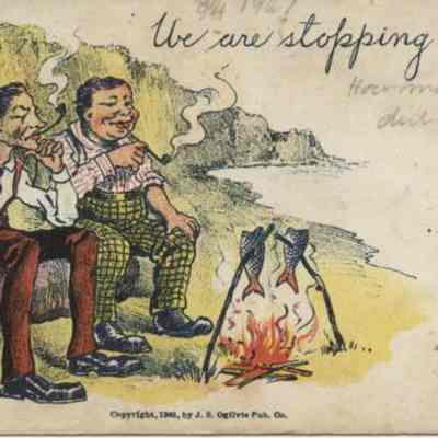 "Comic postcard of two men smoking a pipe and roasting fish on a fire. "We are stopping here."Acquisition