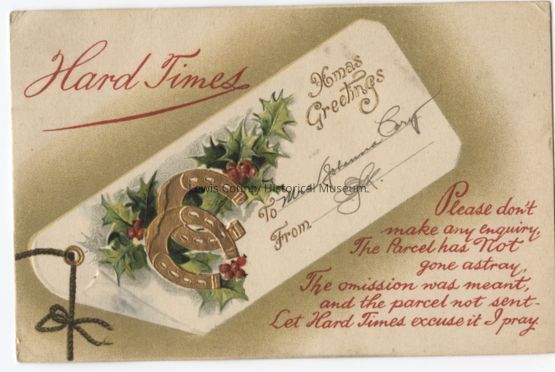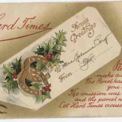 "Hard times Christmas Greeting, message reads, "Please don't make an inquiry, the parcel has not gone astray, etc." Postmark: Avon, North Dakota, Dec. 19, 1910."Cataloged By