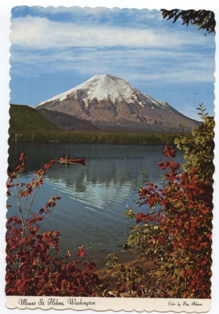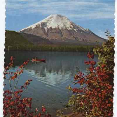 Color postcard - showing a canoe on Spirit Lake in the fall. Mt. St. Helens is in the background. Circa 1970's.Lexicon