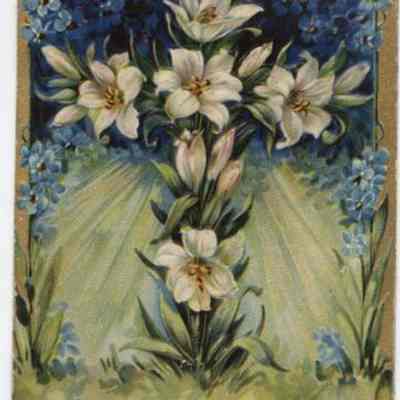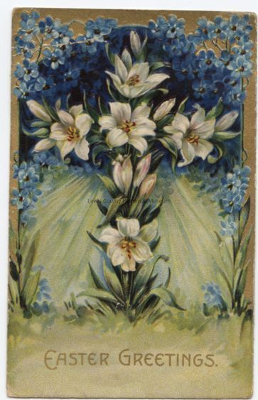 Easter Greeting, cross formed of Easter Lilies. Blue forget-me-nots in back ground . Postmark: City & date illegable, year 1909, South Dakota.Cataloged By