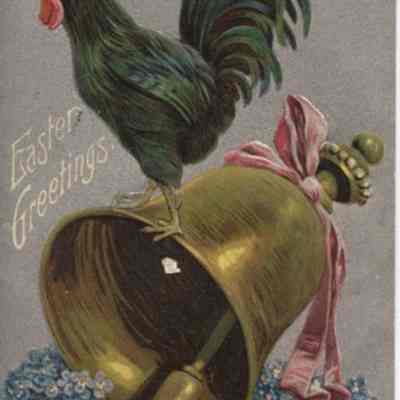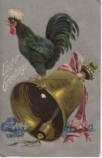 "Color postcard of chicken standing on bell. "Easter Greeting"."Acquisition