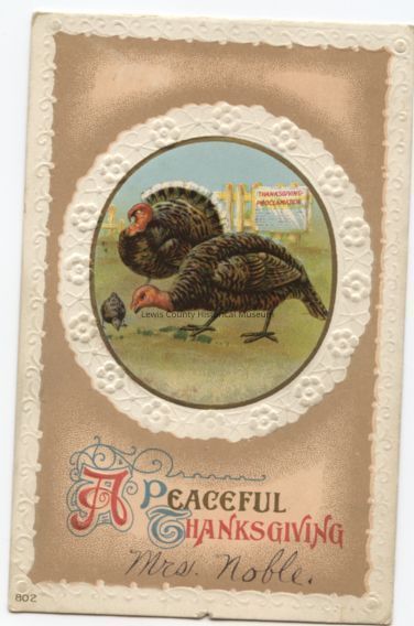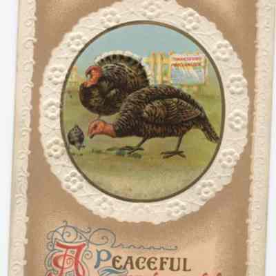Thanksgiving Greeting card, picture shows a turkey gobbler, a turkey hen and a turkey chick.Cataloged By