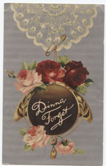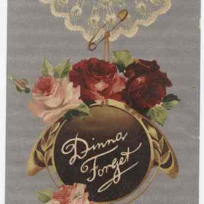 "Greeting card, captioned "Dinna Forget", printed in Saxony, Germany. Red and pink roses, gold safety pin and circlet of lace. Postmark: Alpha, WA, July 24, 1908. "Cataloged By