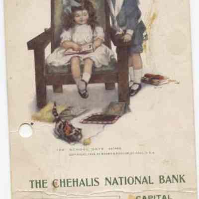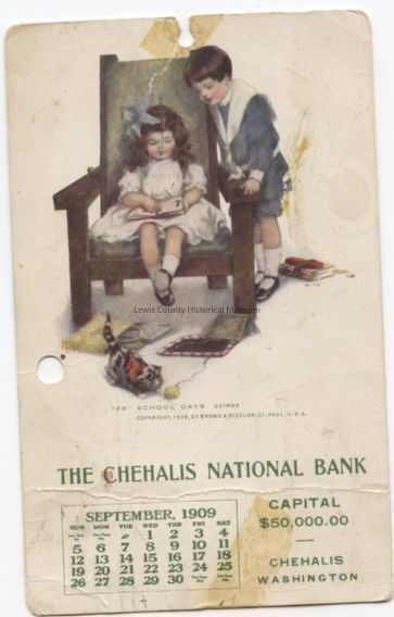 A souvenir calender postal card which bears the picture of a young girl, boy and kitten. From the Chehalis National Bank, September 1909. Postmark: Chehalis, WA., Sept. 4, 1909.Cataloged By