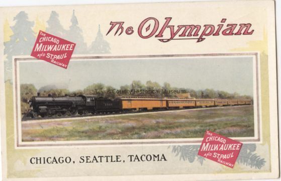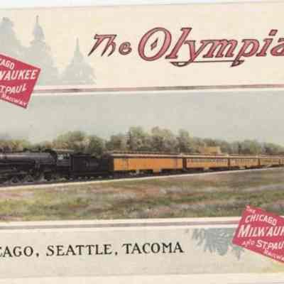 Scene shows a train, the Olympian, owned and operated by the Chicago, Milwaukee and St. Paul, which ran between Chicago, Seattle and Tacoma.Cataloged By