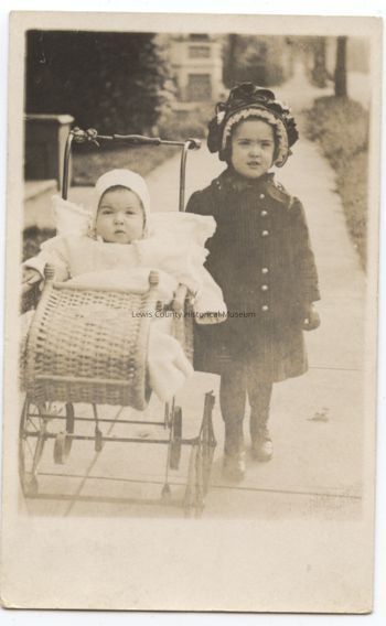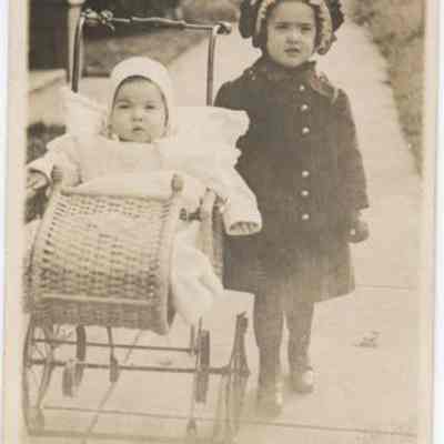 Black & White postcard - Portrait of, L to R: Isabelle Crowell in buggy and Barbara Crowell Wood, wife of Tom Wood, Chehalis resident since circa 1950. Postmarked: Portland, OR, Dec. 20, 1912. Also see P - 6644. Photo circa 1912 - 1913.Acquisition