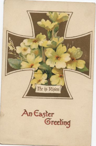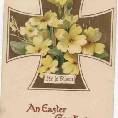 Easter Greeting, a gold cross on which a clump of yellow primroses rest.Cataloged By