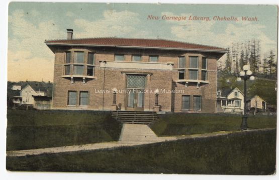 Picture postcard of New Carnegy Library, Chehalis, WA (now Chehalis Timberland Library). Exterior, front view. Cancellation: Chehalis, WA., Oct. 19, 1911. 1¢ stamp.Cataloged By