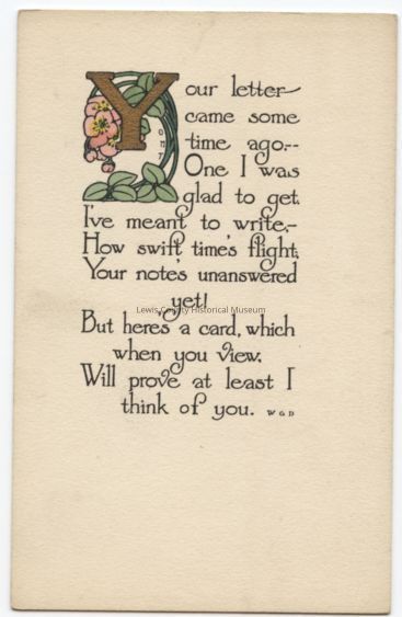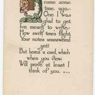 Thinking of your greeting, with message a printed verse.Cataloged By