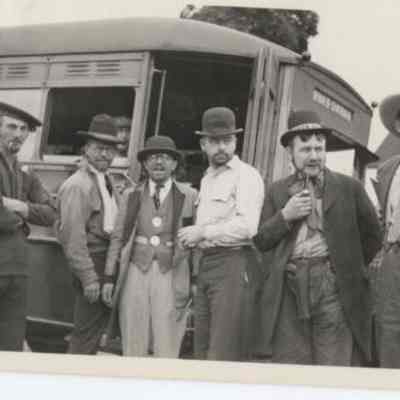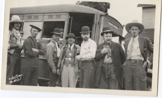 Pioneer Picnic Parade - 1933, Centralia, WA. L to R: unknown, Loomis, Marion Samples, Milt Jastrem,Vern Fear, Charley Buss, and Johnnie Kames.