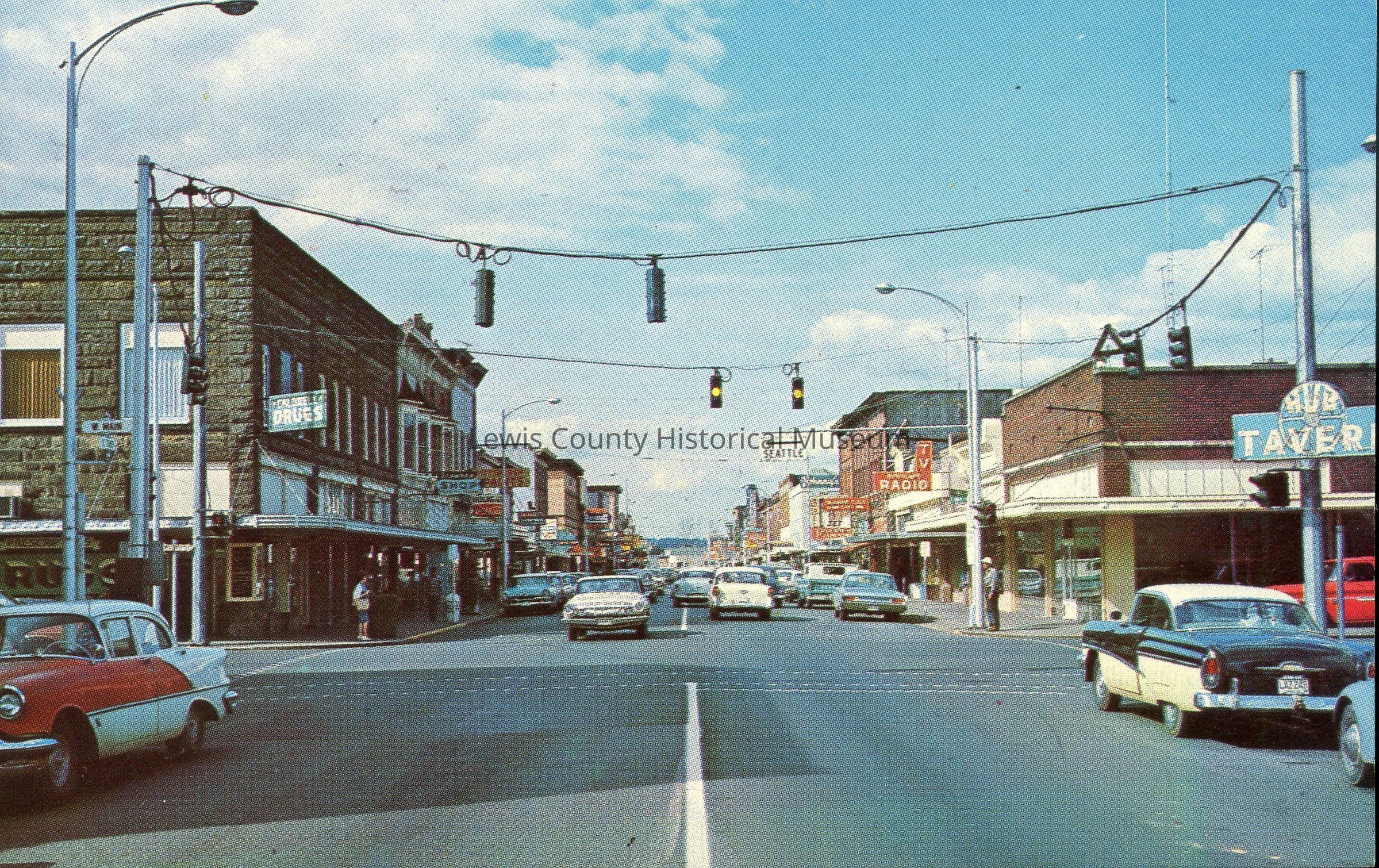 Color print postcard - Centralia, WA, Main & North Tower looking north. Photo circa 1955.Collection