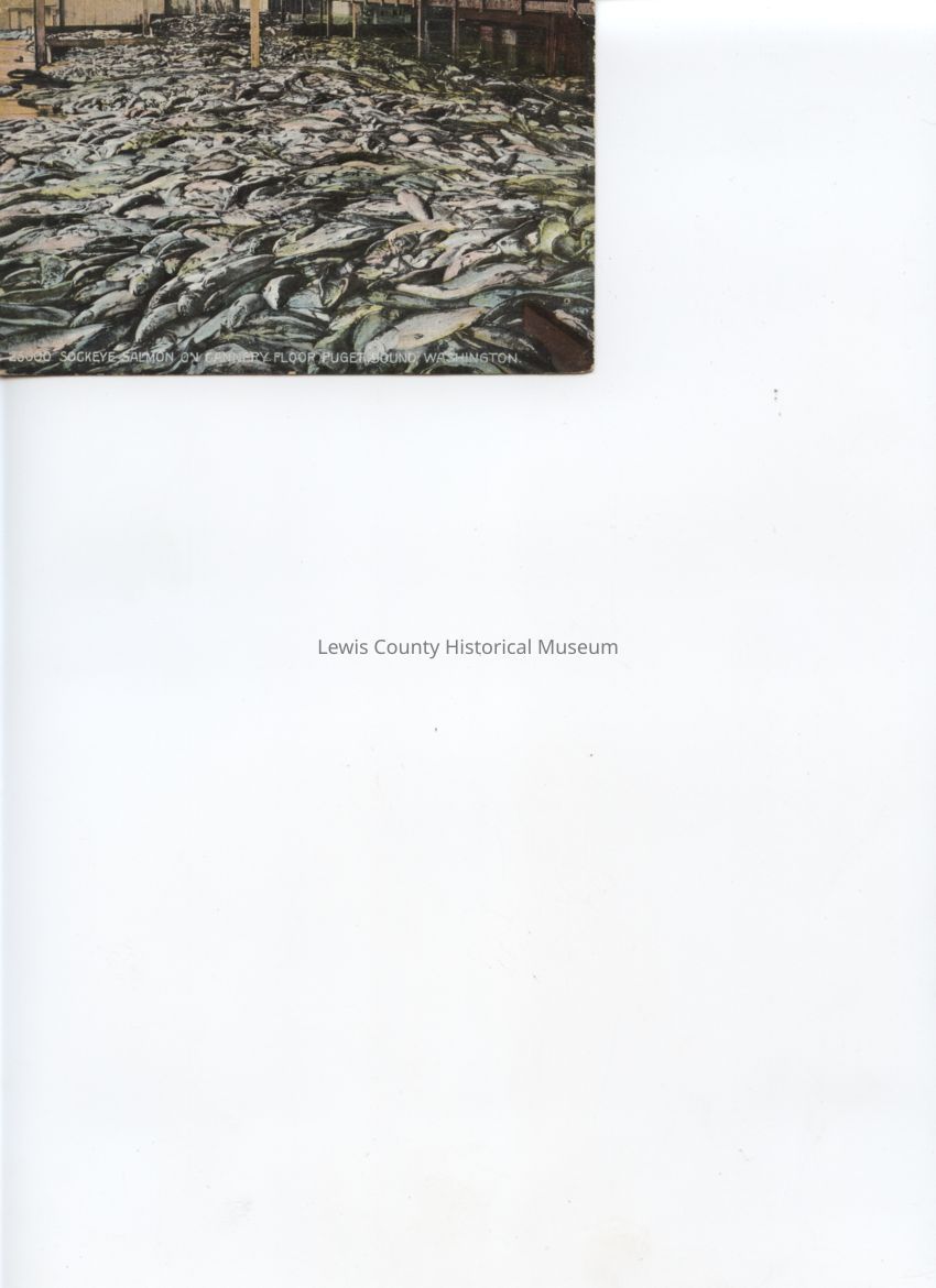 Color card, showing 25,000 Sockeye Salmon on the cannery floor at Puget Sound, WA. Postmark 1911. Postmark: Caldwell, Idaho, Nov. 1, 1911. 1¢ stamp. From the Louis Griel collection.Cataloged By