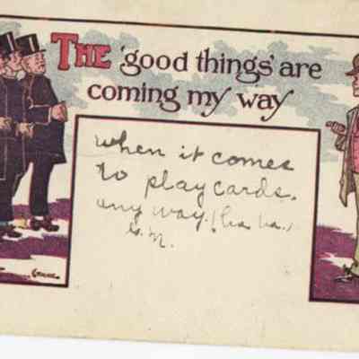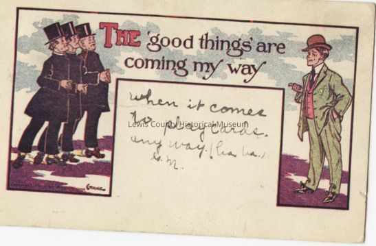 "Humorous card, shows a "dandy" who is being approached by 3 ministers. A caption is "The Good Things Are Coming My Way". Postmark: Alpha, WA, Nov. 23, 1907. 1¢ stamp."Cataloged By