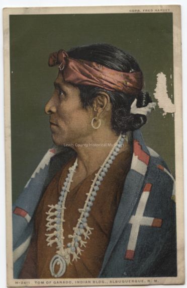 "Photo of "Tom" of Ganado, Indian Building, Albequerque, New Mexcio., in Southwest Indian garb., head band, earring, turquoise and silver beads, blankets."Cataloged By