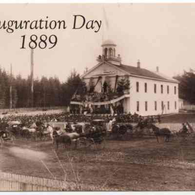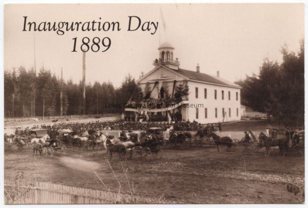 Black & White postcard -The State Capitol Building in Olympia, WA, where Elisha P. Ferry is being sworn in as the first governor of the new sovereign state of Washington. Monday, November 19, 1889 - Inauguration Day.Lexicon