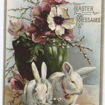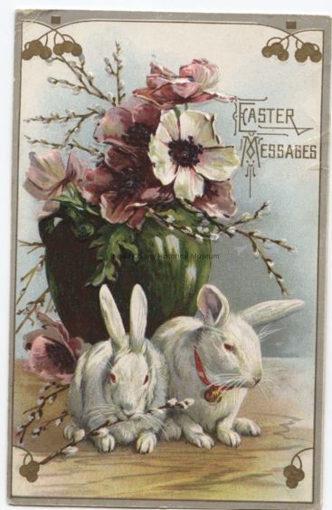 Easter message, a vase holds large white & pink popies, two white bunnies sit in front of vase. Postmark: Chicago, Ill., Apr.3, no year.Cataloged By