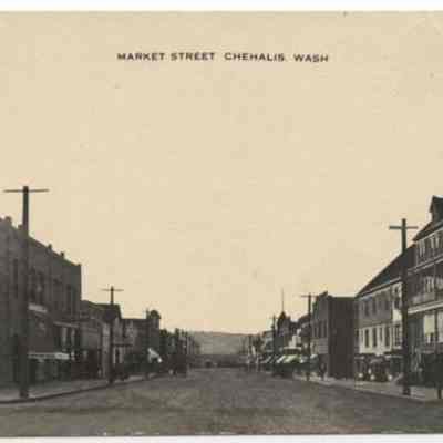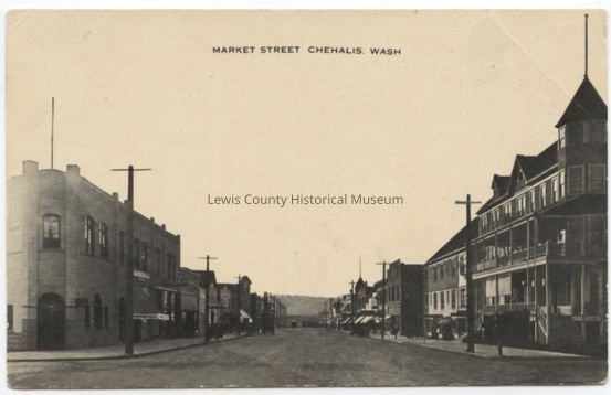 Black & White postcard - Park & Cascade at Market Street, Chehalis, WA. On left Geissler Building & on right St. Helens Hotel, looking north, circa 1900.Acquisition