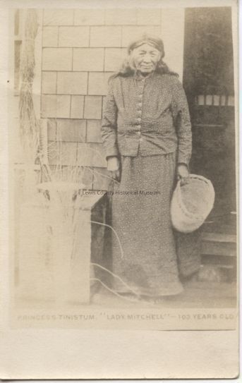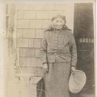 "Postcard found in Museum of Princess Tinistum "Lady Mitchel"- 103 years old. Indian woman wearing 2 piece dress (long) holding basket, standing in front of shingle front buliding."Cataloged By