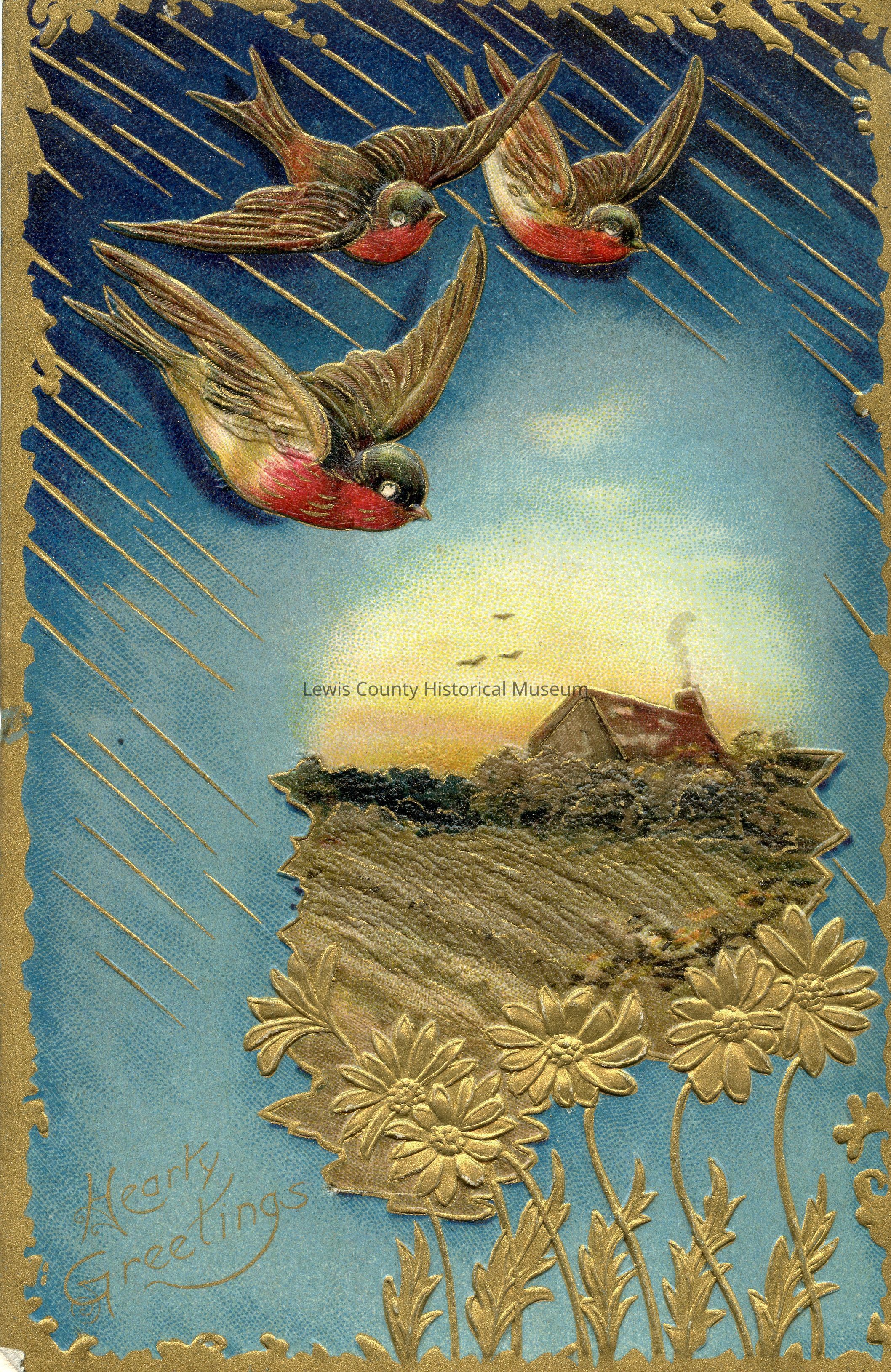 Drawing of a house beyond a field. Birds are flying over the drawing and gold flowers are under the drawing. "Hearty Greetings" is printed on the card.Lexicon