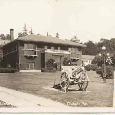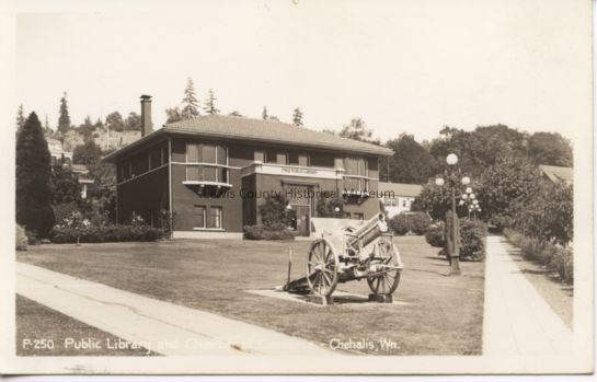 Photo copy P8173. Edwin Blair originals. Excellent view of the front of the Chehalis Public Library building. Taken prior to remodeling in the 1930's. Shows the cannon on the grounds and very early street lamps. Have negative.Acquisition