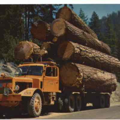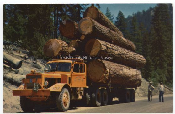 Color postcard - Diesel logging truck on a mountain road in Washington State. Photo circa 1965 - 1967.Lexicon