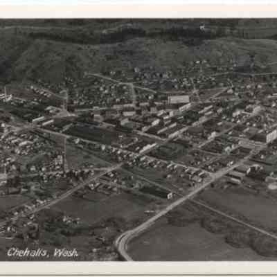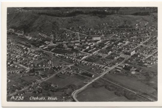 Black & White postcard - Aerial view of Chehalis, WA. Large building in center is St. Helens Hotel. The building to right is the County Courthouse, with Main Street going west toward Alexander Park. Photo circa 1935 - 1938.Acquisition