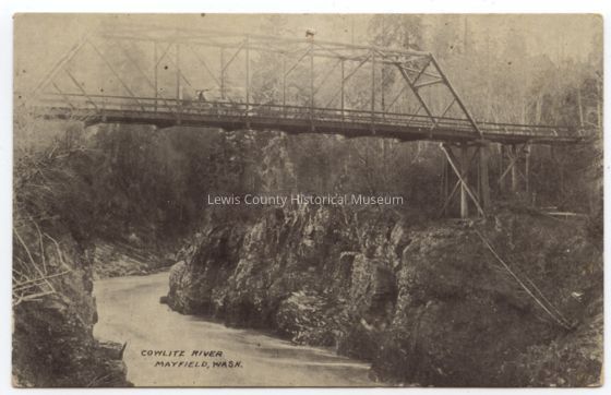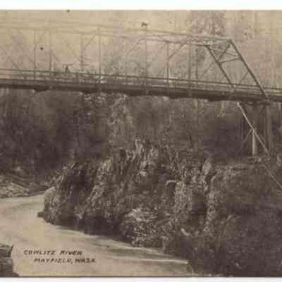 Black & White postcard - Cowlitz River and first steel bridge at Mayfield, WA. Photo circa 1916.Acquisition