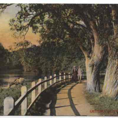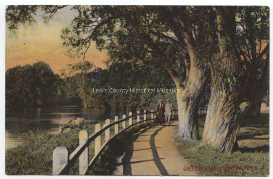 "Color postcard - "Greetings from Washington" tree lined path along a river. Card addressed to Miss Lena Jackson at Centralia, WA, from Bucoda, WA, March 8, 1909." 1¢ stampLexicon