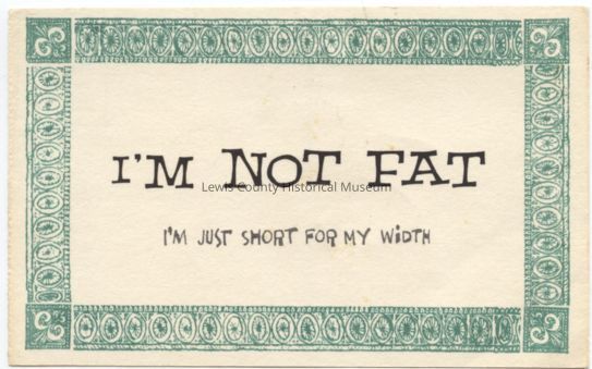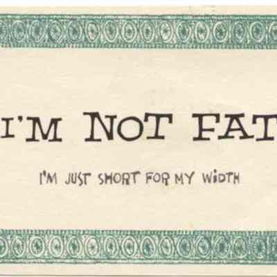 "White card with turquoise border says, "I'm Not Fat, I'm Just Short For My Width"."Lexicon