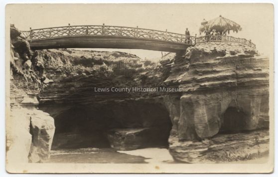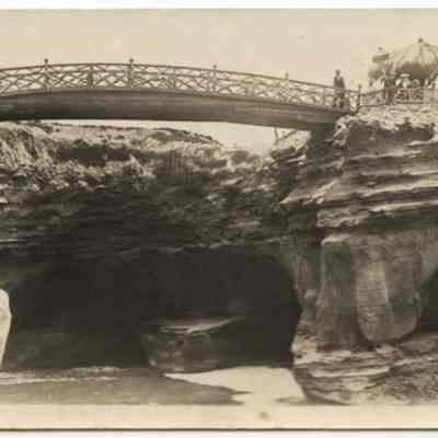 Sepia tone postcard - Photo of an unidentified foot bridge near an unknown beach.Lexicon