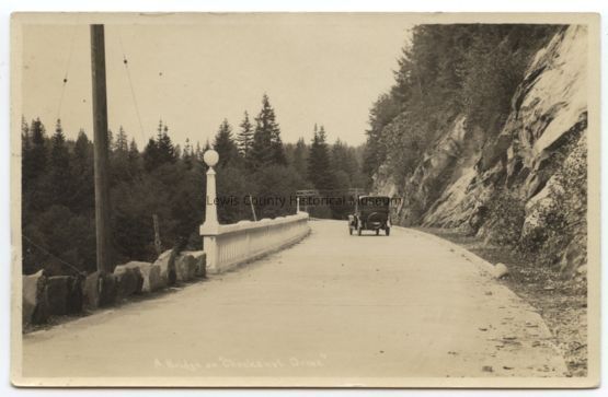 Mountain highway and 1920's auto sedan going along. A cement decorative fence and lamp post are alongside of road; high steep embankment on other side. black and whiteLexicon