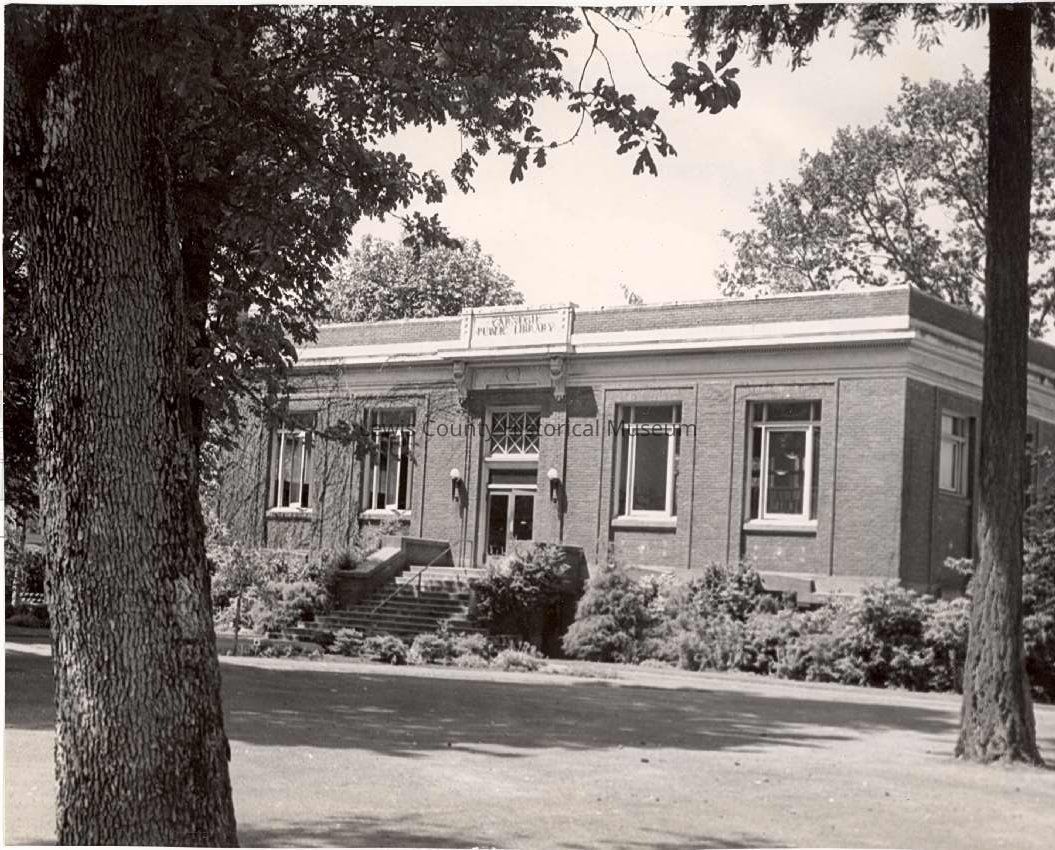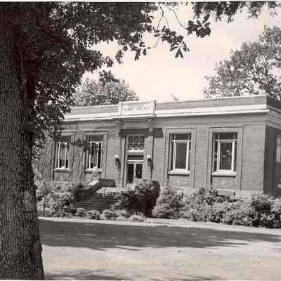 Carnegie Public Library (Centralia Timberland Library) Centralia, WA. One story brick building, Oak tree in foreground. Have negative.Collection