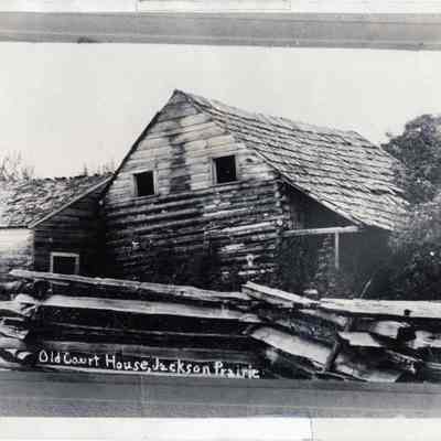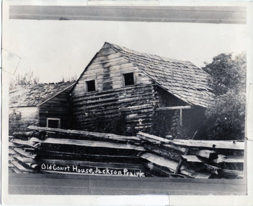 Photo of the old Jackson Courthouse and Home in Jackson Prairie before it was renovated. Out building in the back and split-rail fence on the side. ca. 1900. Courthouse was used as the Territorial Court, Inn, and Post Office.Collection