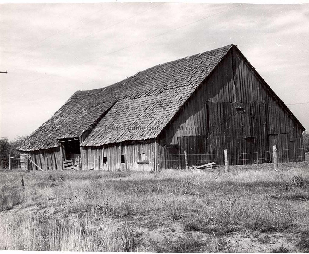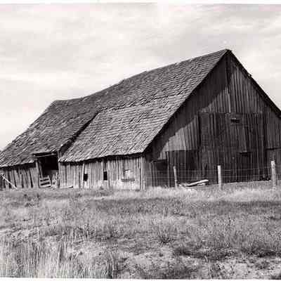 Old barn near Ethel, WA. severly damaged by the Oct 12,1962 windstorm. Hand split cedar shake roof, vertical barn boards, barbed wire fence, pasture in the background. Have negative.Collection