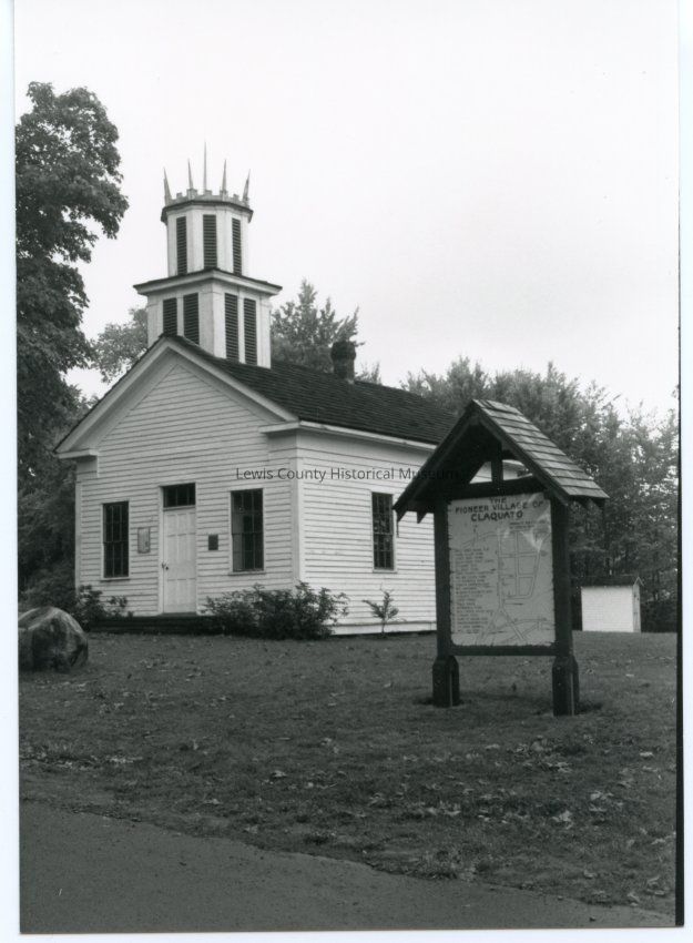 Photo of the Claquato Church 1986 with Monument and Village Marker in front. Have negative.Collection