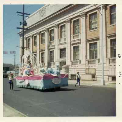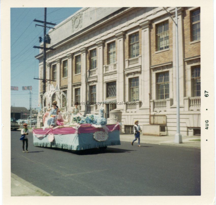 SWW Fair Parade, August 1967, Chehalis, WA. Chehalis Courthouse in background. Have negative.Lexicon