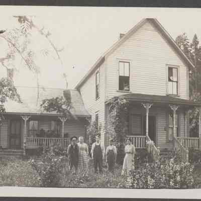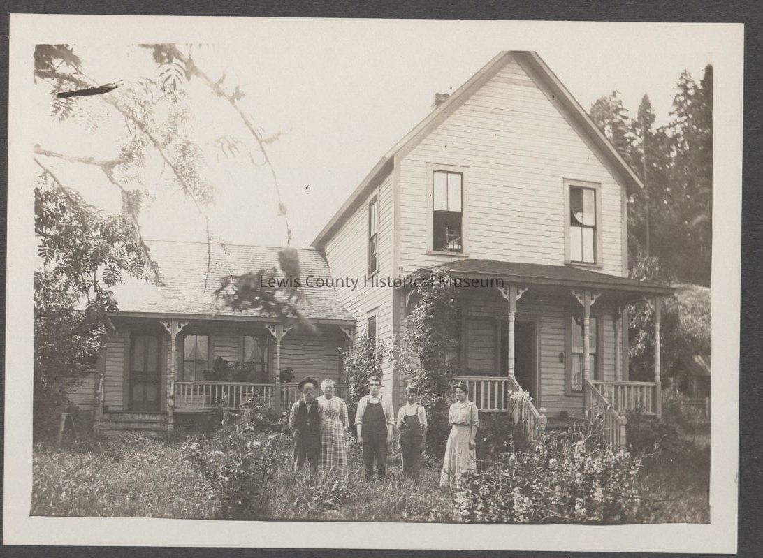 Harris family house at Boistfort in 1914. Grandpa Edward Harris, Grandma Eliza Harris, Fay Sweany (Sweeney), Roy Harris and Emma Harris. Cardboard mounted, black and white, Burke collection, 03.22.Collection