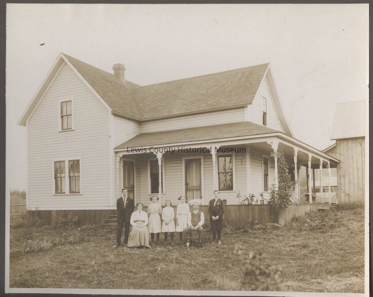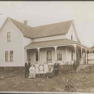 Glen and Alice Roundtree with children in front of their house, ca. 1910. Oliver on left, Orville on right; Bernice, Hazel and Helen, the daughters. Cardboard mounted, black and white, Burke collection, 03.22.Collection