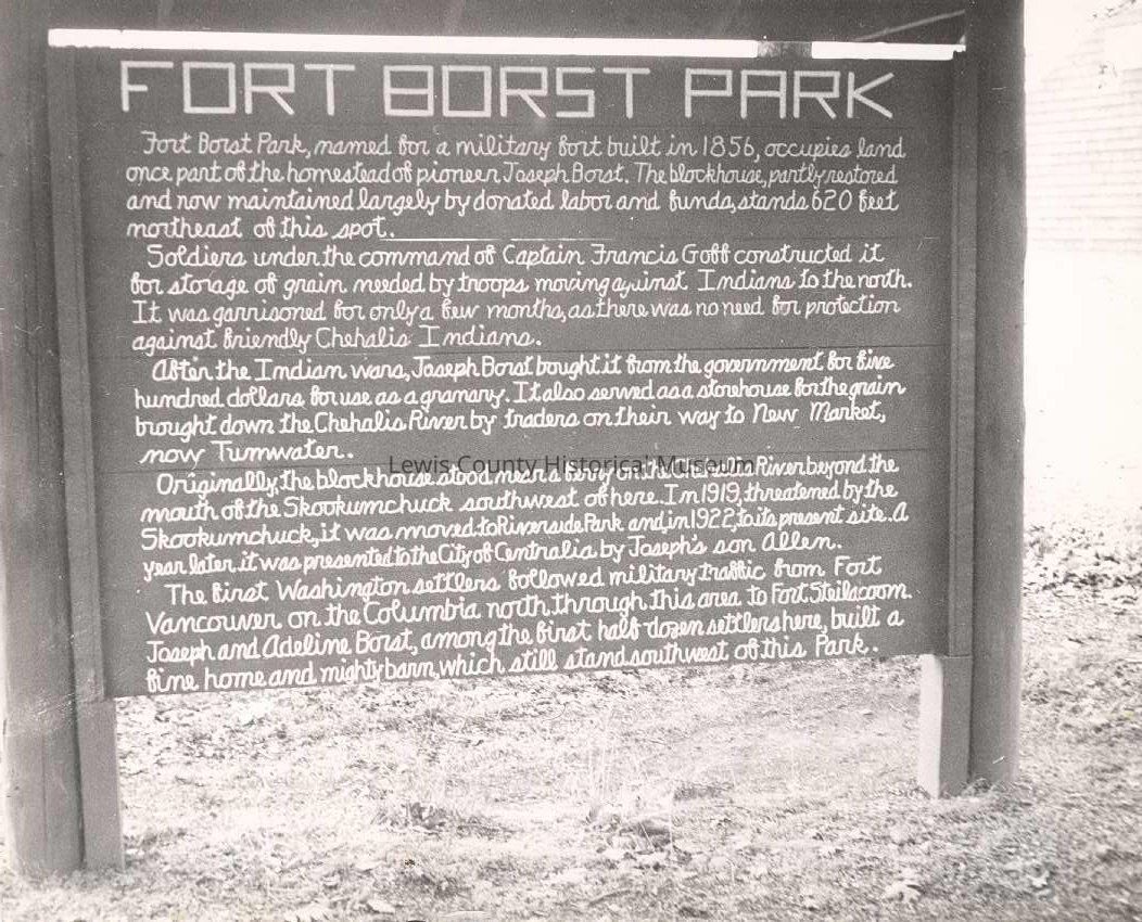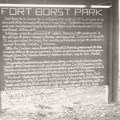 Close up of Historical marker at Fort Borst Park, Centralia, WA. Tells the history of the Fort. Have negative.Collection