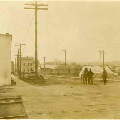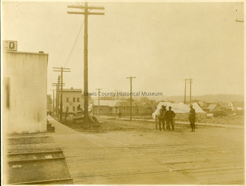 Excellent view of Market and West Street in Chehalis, WA, taken in 1906. Looking west between the mainline RR track and an industrial spur by (1987) National Fruit Cannery building on the left. Tent on sit of Albers Feed Store in 1987. Man in center of photo is near State and West Street intersections. P9429 is 1976 view from the same location.Collection